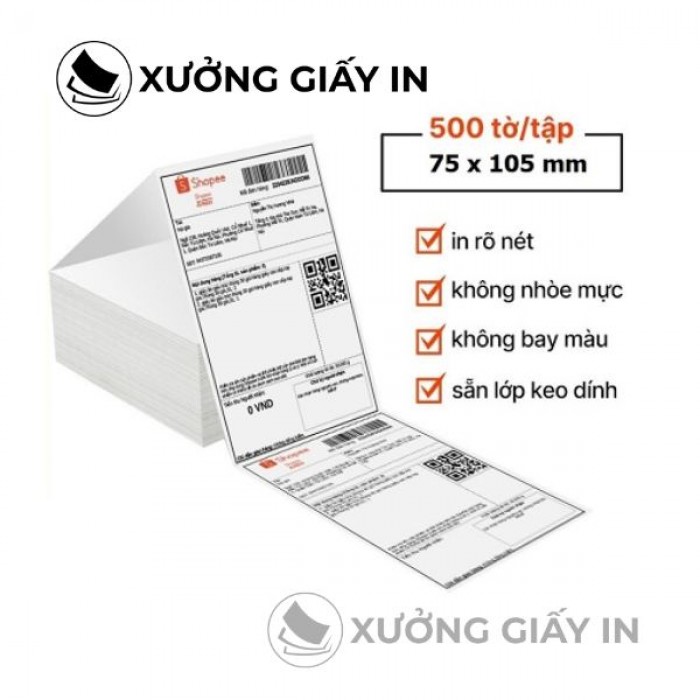 Với kích thước chuẩn 75x105mm và quy cách tệp 500 tem, sản phẩm thường được sử dụng để in tem đơn hàng, tem vận đơn, tem mã vạch cho các shop online và đơn vị vận chuyển. Đây là lựa chọn phổ biến cho việc in tem đơn hàng trên các sàn thương mại điện tử như Shopee, Lazada, Tiki, TikTok Shop.