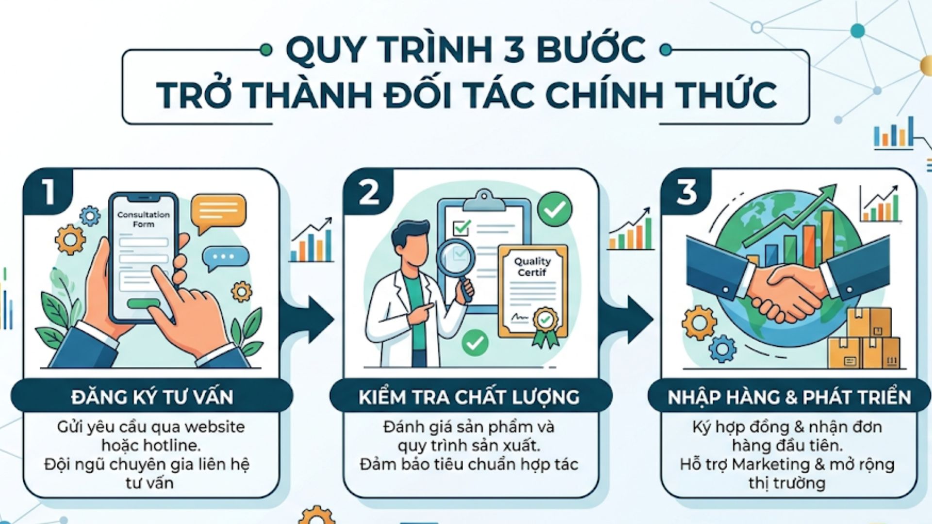 - Nhập hàng & Phát triển: Nhận báo giá đại lý cấp 1 ưu đãi nhất và bắt đầu triển khai cung cấp hàng hóa ra thị trường.